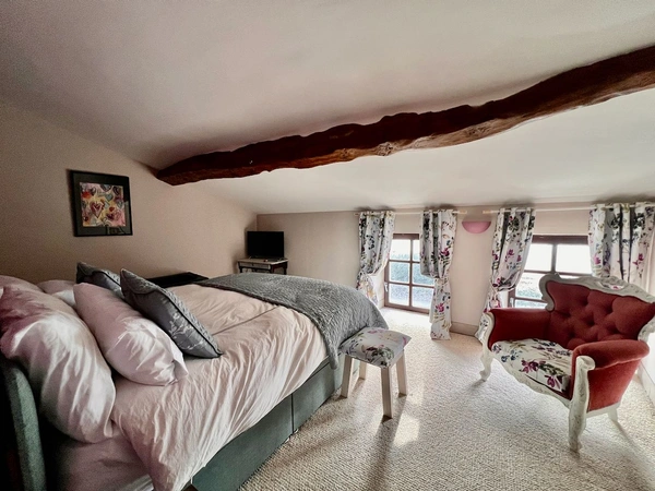 The heart of the property is a magnificent open-plan living space featuring exposed timber beams, terracotta tiled floors and a striking double-height cathedral ceiling. A double-sided wood-burning stove forms a warm focal point, connecting the main living area with the adjoining snug. The snug can easily serve as a ground-floor bedroom, offering flexible four or five bedroom accommodation, complemented by a ground-floor bathroom.
